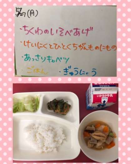 『ちくわのいそべあげ』は、ちくわに青のりの入った衣をつけて油で揚げる、毎回好評な献立です☆☆☆