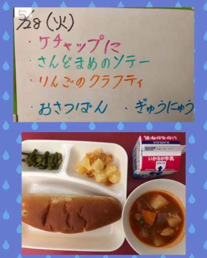 『ケチャップ煮』は、鶏肉を主材に、じゃがいも、たまねぎ、にんじん、青みにグリンピースを使用し、トマトピューレ、ケチャップなどで味つけしています☆☆☆
