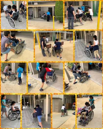 車いすを使用する時の注意点を教えてもらい、2人ペアになって、乗る人、おす人を順番に体験しました!!!