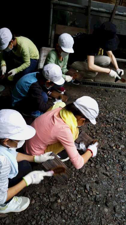 雨が強くなってきたのでテントの下で焼き板磨きです。ここで大切なのは「根気」!