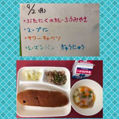 『豚肉のカレー風味焼き』は、豚肉にワイン、塩、こしょう、カレー粉、油で下味をつけ、ピーマンと混ぜ合わせて焼き物機で焼いています☆☆☆