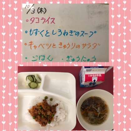 『タコライス』は、沖縄料理のひとつで、牛ひき肉、豚ひき肉、たまねぎをカレー粉、トマトピューレ、ケチャップ、ウスターソースなどで味つけし、青みにグリンピースを加え、ご飯のうえにかけて食べます☆☆☆