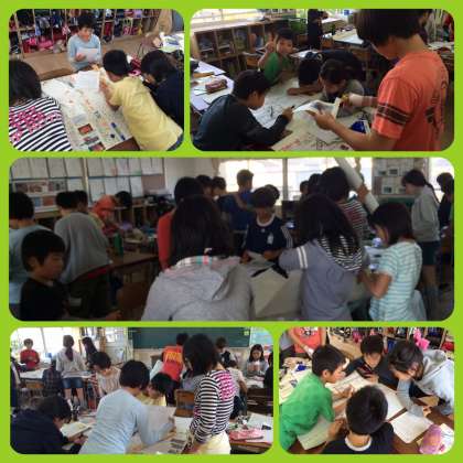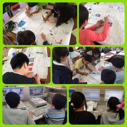 『地震』『台風』『集中豪雨』『火山の噴火』の自然災害について、班に分かれ新聞作りをしています。