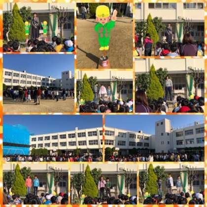 ★6年生が、自分達の学校や街がより素晴らしい場所になってほしいというテーマのもといろいろな活動に取り組んでいます。その一つとして、「あいさつまいもマン」というキャラクターが、毎朝、正門であいさつ運動に取り組んでいます。ほかの学年の人たちも気持ちのよい挨拶が響いていますよ。正門は6年生に任せて、校長先生は校内をまわっていますが、廊下や階段でもあいさつができる人が増えてきました。素晴らしいです。これからも、あいさつをしっかりして良い1日をスタートしましょう。