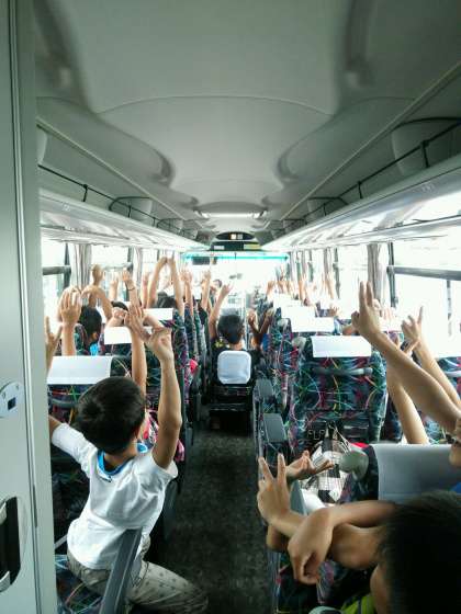 子どもたちは、バスの中でも楽しく元気に過ごしています。