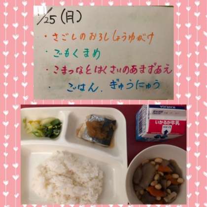 『五目豆』は、大豆煮、鶏肉、こんにゃく、にんじん、れんこん、ごぼう、切りこんぶを使用し、砂糖、みりん、塩、うすくちしょうゆ、こいくちしょうゆで味つけした、噛みごたえのある献立です☆☆☆