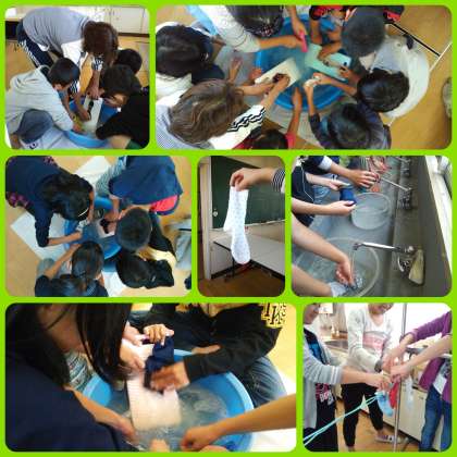 水と洗剤を入れた大きなたらいの中で、手でのもみあらいや洗濯板でのこすり洗いなどをしました。その後、流水ですすぎをし、干すところまでしました。