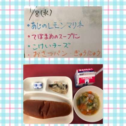 『あじのレモンマリネ』は、でんぷんをまぶしたアジを揚げ、玉ねぎを炒め、レモン汁、砂糖、塩、酢などを合わせて作った調味液とあえたマリネ液と揚げた味をからめていただきます☆☆☆