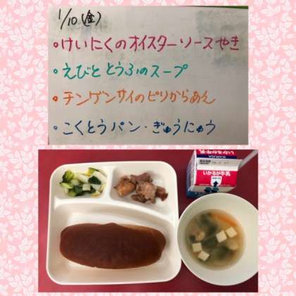 『えびととうふのスープ』は、えび、とうふ、玉ねぎ、にんじんを使用し、青みにニラを加えています☆☆☆