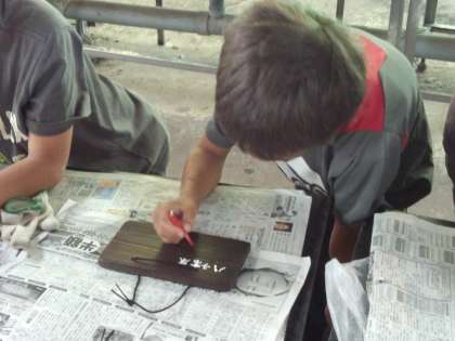 焼き板をゴシゴシ磨いて艶を出し、板に三日間の思い出を描いて出来上がりです♪