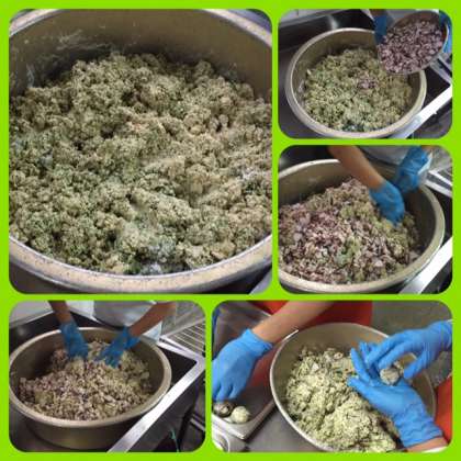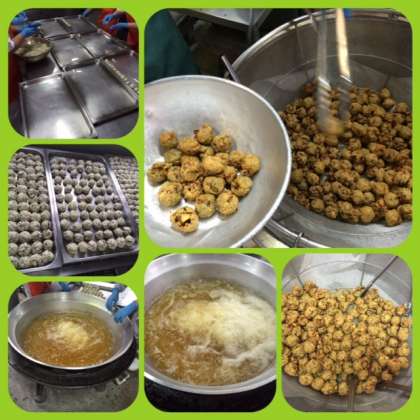 丸め、熱した油であげ、ソース(トンカツソース、ウスターソース、砂糖を煮る)をからめて出来上がりです!!!