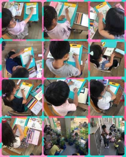 外で観察した後は、教室で色を塗ったり、感想を書いたりしていました(^^♪