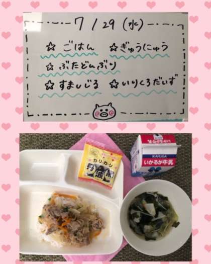 『豚丼』は、豚肉、糸こんにゃく、たまねぎ、にんじんを炒めて煮、ご飯に合う味付けに仕上げています☆☆☆