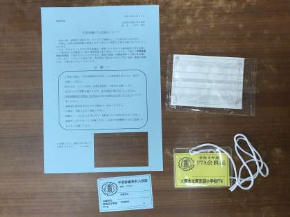 ご来校の際は、画像の「学習参観特別入校証」・マスク・名札(PTA会員証)を忘れないようにお持ちください。「学習参観特別入校証」は、受付でご提出ください。
