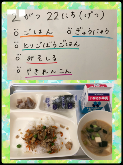 『鶏ごぼうご飯』は、しょうが汁で下味をつけた鶏ひき肉を主材に、つきこんにゃく、ごぼう、にんじん、グリンピースを使用しています!!!