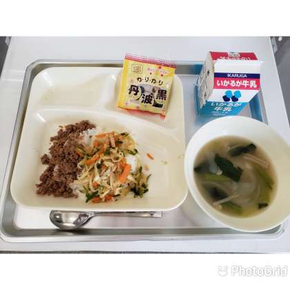 給食では、春と秋の2回登場します。春のビビンバは、だいこんの代わりに切干大根を使用しています。ごま油でにんにくを香りよく炒めた後、砂糖、料理酒、こいくちしょうゆ、コチジャンで味付けした牛ひき肉と豚ひき肉が、ご飯と絡まり食欲をそそりました。