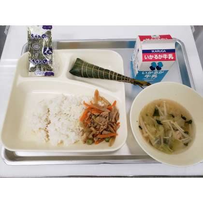 うるち米の粉などで作ったもちを笹の葉で包み、い草で巻いて作られています。原材料はすべて国産で、もちは愛知県の工場で製造され、新潟県の工場で地元の熟練の職人が笹巻きを行っています。子どもたちの成長を願い、こどもの日の行事献立として毎年登場しています。