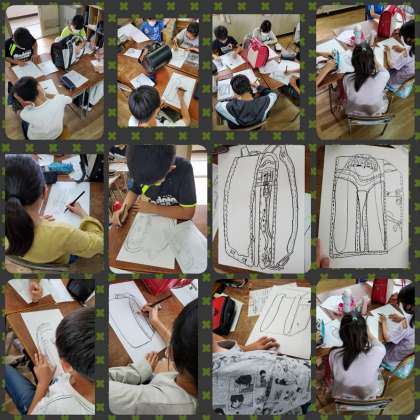 「上」、「手前」、「角度」、「厚さ」を意識して考えながら、ランドセルを立体的に描きました。