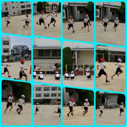 3年生の体育の様子です、力いっぱい走っています。鉄棒をしているクラスもありました。