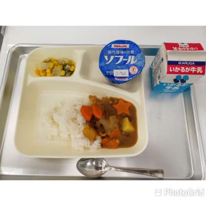 調理員さんが人参を星形にくりぬいてくださった「ラッキーにんじん」。各学級に10個くらいずつ平等に入れてくださっています。あたった人にはラッキーなことがあるかも!?