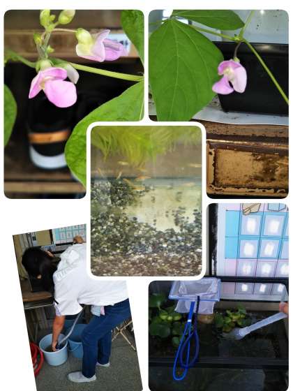 インゲン豆の花が咲きました。メダカも元気です。水槽の手入れなど、世話をしています。