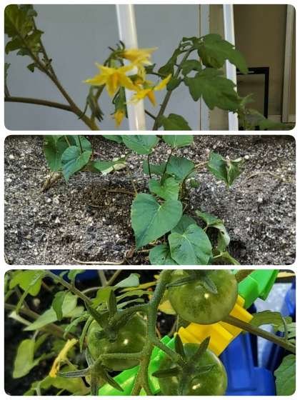 ミニトマトの花が咲き、実も顔をのぞかせています。サツマイモの葉もどんどん増えています。
