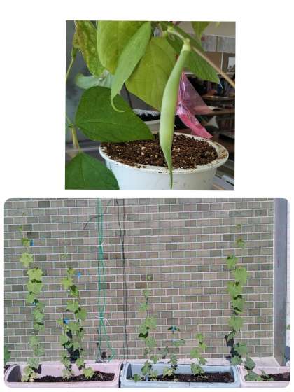 5年生のインゲン豆に実ができていました。4年生のヘチマも元気につるをのばしています。