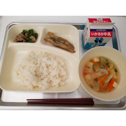 給食室で朝一番、こんぶを水につけて戻し、じっくりと煮だしたこんぶとけずりぶしで出汁をとった五目汁です。