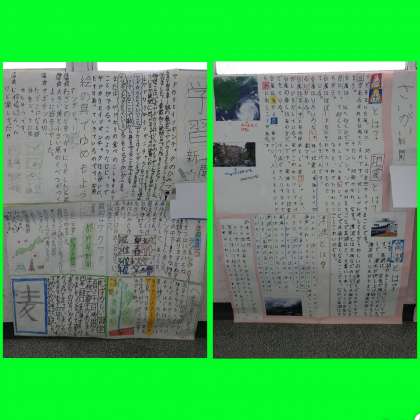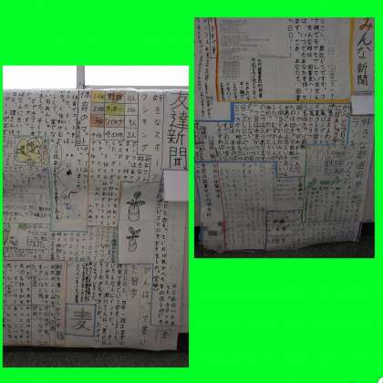 4年生では、いろいろな題材で新聞作りをしました。教室や廊下に掲示しています。