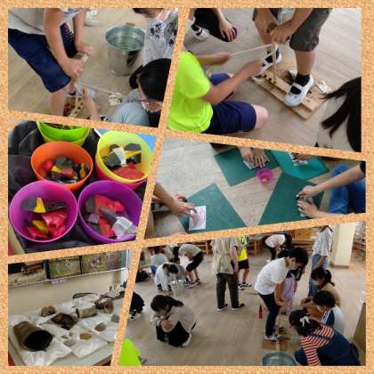 大昔の人と同じように、木の棒と板を使って火おこし体験をしたり、石のナイフを使って紙を切ったりしました。