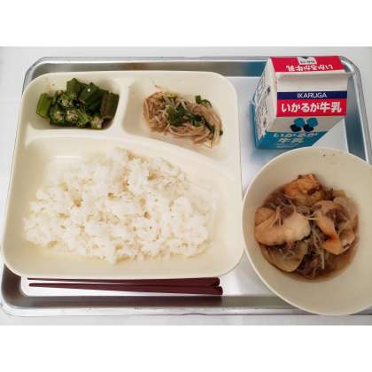 「ふ」の個別対応献立です。今回は白菜のかわりにたまねぎを使用したすき焼き煮です。甘辛い味が具材によく染みて、食がすすみました。