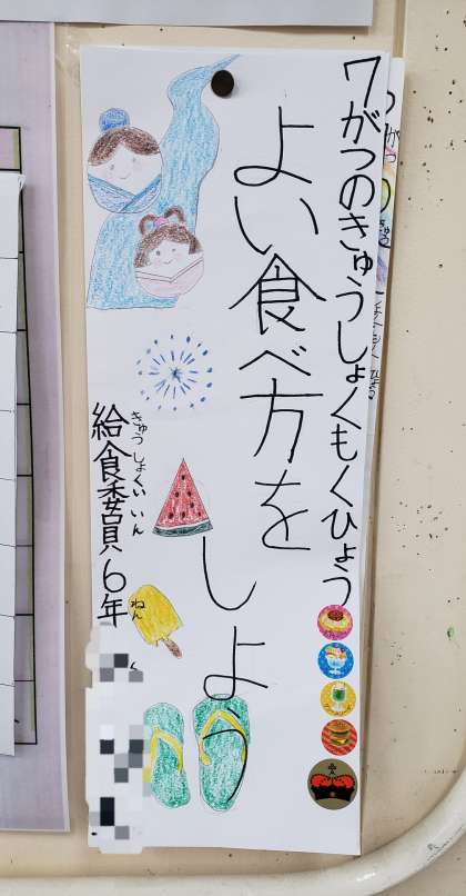 発表されたクラスには、各教室に掲示する7月の給食目標の短冊に王冠シールが貼られています。また励みにしてくださいね。
