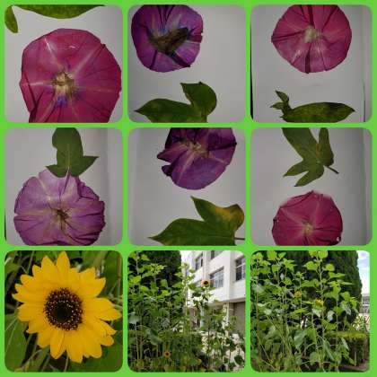 昨日の強い雨にも負けず、3年生のひまわりは、まっすぐ育っています。1年生は、あさがおを「おし花」にしました。