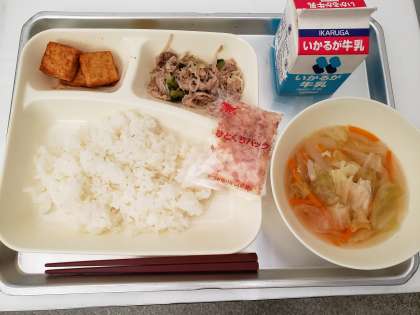 ゴーヤは給食には1年に1回だけ登場します。豚肉ともやしを一緒にいため、食べる前に1人1袋のかつおぶしをふりかけることによって、旨みと風味を添えています。苦手な子どもも多いゴーヤですが、加熱しても壊れにくいビタミンCを多く含み、ほんのり感じる苦み成分には食欲を増進させる働きがあります。