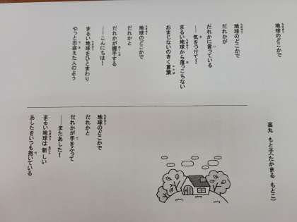 今週の詩は、高丸もと子さんの「地球のどこかで」です。この詩には、「気をつけて!」や「こんにちは!」、「またあした!」ということばが入っています。心がホッと温かくなる言葉ですね。ぜひ、まわりの人に伝えてください。