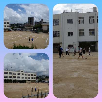 本日放課後に教職員で運動場に、にがりまきをしました。運動場の砂ぼこりを防ぐための作業です。運動会に向けて、環境を整えていこうと思います。