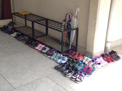 3日前のことです。校内を見回っていると、保健室の前と講堂の前でこのような光景を目にしました。とてもいい気持ちになりました。ご家庭の躾と先生たちの指導の賜物だと思います。一人で行動する時も、このように身の回りのことを振り返り、余裕をもって行動できる人であってほしいと思います。