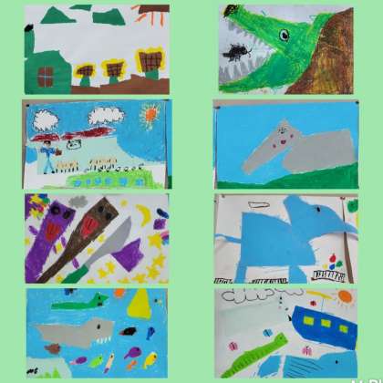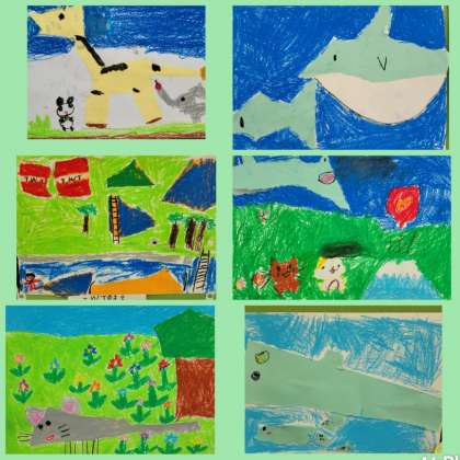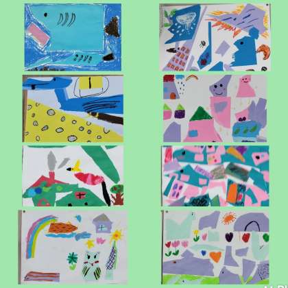 図画工作「やぶいたかたちからうまれたよ」の教材では、紙を破いたり、ちぎったりして、できた紙をならべてみました。