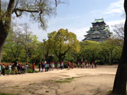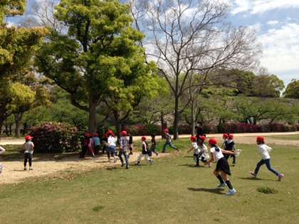 晴天に恵まれ、2年生は予定通りに大阪城へ遠足に行きました。学校と駒川中野駅までの往復の歩行中も、駒川中野駅と谷町四丁目駅までの往復の乗車中も行儀よく行動することができました。大阪城の西の丸庭園に着いてすぐ、荷物を置いてクラスごとに春の自然探しをしました。何人かの子どもが「四葉のクローバー」を見つけていました。私が見つけられないでいると、一人の男の子が「ぼくいらんからあげよ。」と言って四葉のクローバーをくれました。今、新聞紙にはさんでいます。昼食の後は、クラスごとにみんなで遊びました。