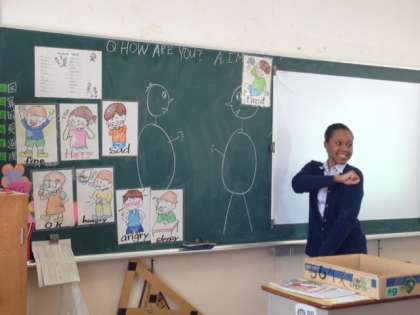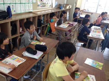 今日はC−NETのTamara先生による英語活動が5年生でありました。今日のテーマは「How are you?」「I’m 〜 」です。まず、Tamara先生と担任の先生が見本をします。その後、子どもたちがやり取りをします。「fine」「 happy」「 sad 」「 ok 」 「 hungry 」 「 angry 」「 sleepy 」「 tired 」という単語を順に入れ、ジェスチャーもつけながら会話の練習をしました。