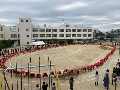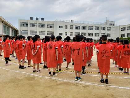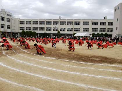 5年生の団体演技です。自分の好きな漢字一文字をはっぴの背中に背負い、力強いソーラン節を踊りました。