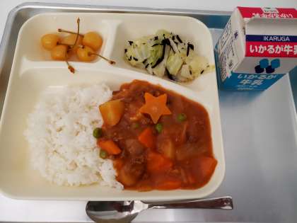 いつもは給食室で小麦粉を炒って作ったブラウンルウでとろみをつけていますが、今日のハヤシライスは小麦アレルギーのある児童でも食べられる、米粉(上新粉)でとろみをつけています。調理員さんがラッキーにんじんを作ってくれました。体育参観でいいことがあるといいですね☆
