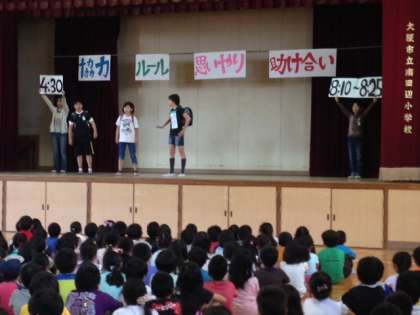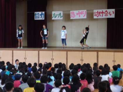 今日は本年度初めての児童集会がありました。運営委員会の子どもたちが、舞台上で寸劇をしながら、一年生にもわかるように「学校のきまり」を教えてくれました。大きな声ではきはきとセリフが言えていること、照れることなく堂々と演じていることに感心しました。さすが南田辺小の高学年!!!