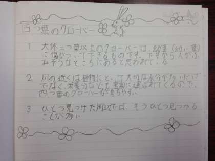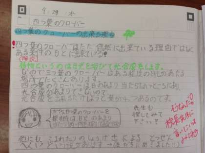 今週の月曜日の児童朝会で投げかけた「四つ葉のクローバーはどうしてできるのでしょう?」という問いに対して、4日間のうちに、口頭で報告にきた子どもが3人、ノートにまとめてきた子どもが2人いました。話を聞いて早速調べてくるという前向きな気持ち、調べたことを話しに来るという行動力、わかりやすくきちんとまとめてくる表現力に感心。ノートを見せるために校長室までたくさんの6年生がついてきました。「このほかにも身の回りにはなんでやろうと思うことがいっぱいあるよ。ぜひ、連休中に調べておいで」と言いました。さて、どんな不思議が集まってくるか楽しみです。