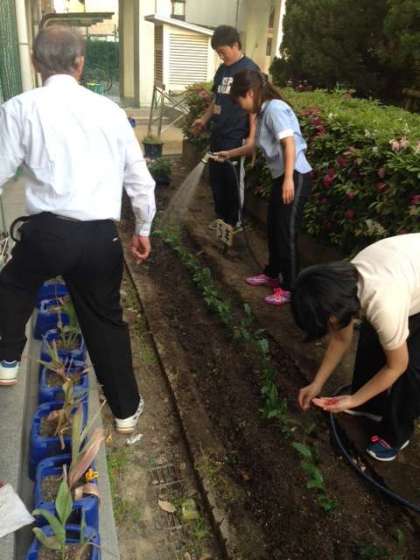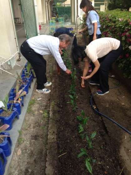 ♪ 夏も近づく 八十八夜〜 ♪ 今日は立春から数えて八十八日目、春から夏に移る節目の日です。八十八夜に摘まれた新茶は、昔から栄養価が高いとされ、古くから不老長寿の縁起物として珍重されてきたそうです。ニュースでも、お茶所京都宇治方面で茶摘みが行われたことが報道されていました。実は、その宇治の茶業協同組合の方よりお茶の苗木をいただくことができました。昨日、5年生の先生たちが花壇を耕し、植え付けを行いました。これから5年生にお世話をしてもらう予定です。お茶からいろいろな❝なんでやろう?❞❝どうなってるんやろう?❞が湧き起りさまざまな学習に広がっていってくれることを期待しています。