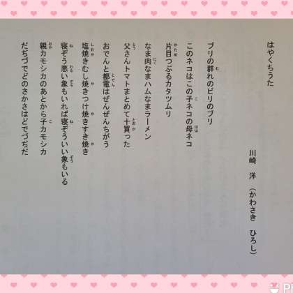 今週は、「はやくちうた」という詩です。先週、関西テレビの村西利恵アナウンサーに出前授業(5年社会「報道の仕事」)をしていただきました。そのときに、口の体操を教えてくださったのですが、ニュースを読む前には、大きく口をあけて「ア・イ・ウ・エ・ベー」と5回言うそうです。「ベー」の時に、舌を思いっきり前へ出すのがコツ。みなさんも口の体操をすると、早口ことばがうまく言えるかもしれませんね。