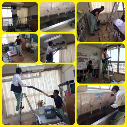 エアコンを稼働するため、家庭訪問期間のお昼から管理作業員さんが各教室をまわり、フィルターの洗浄をしてくれています☆☆☆