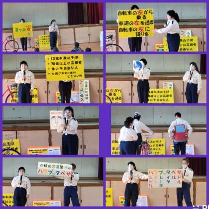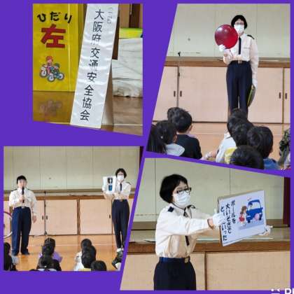 大阪府交通安全協会の方に来ていただいて、交通安全学習をしました。道路の正しい歩き方を学習した後、実際に歩く体験をしました。最後に自転車の正しい乗り方について、学習しました。
