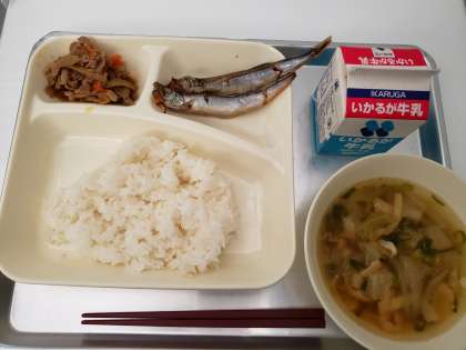 給食に使われているししゃもは、カラフトシシャモ(カペリン)と呼ばれる魚です。料理酒で下味をつけ、網を敷いた鉄板で焼き上げます。