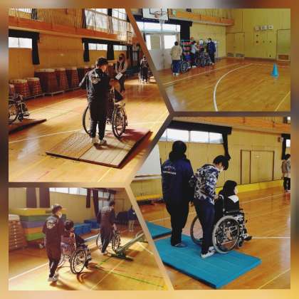 6年生が社会福祉協議会の方に来ていただき、車いす体験を行いました。説明を受けた後、実際に友だちを車いすに乗せて介助する体験をしました。声かけをしながら、車いすを押すことができました。